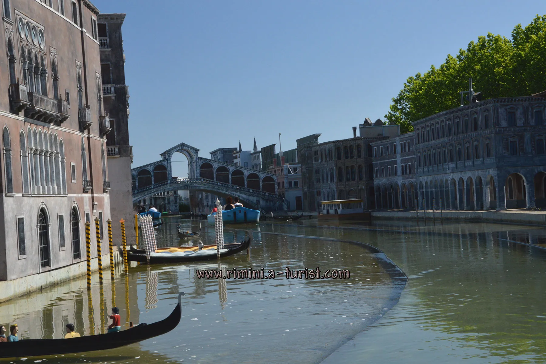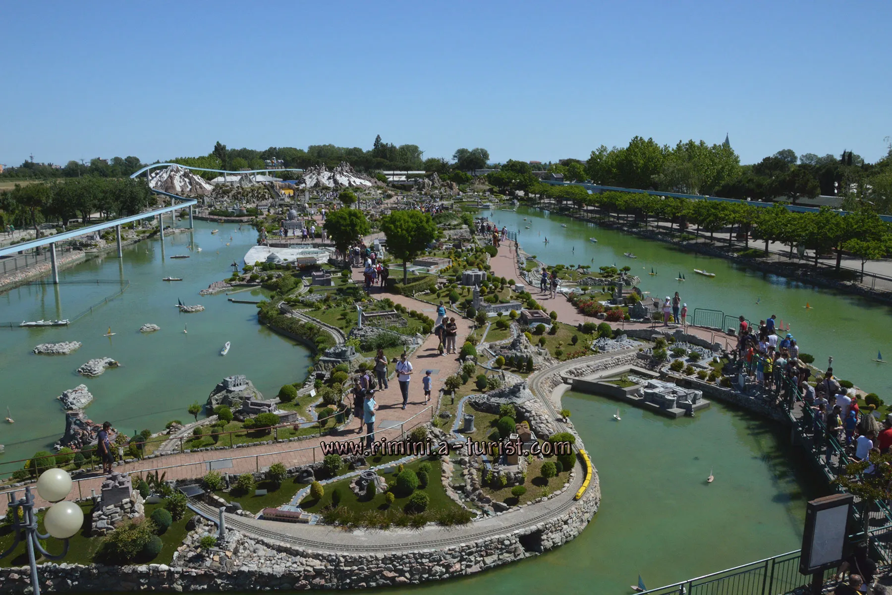 Другим унікальним місцем, заслуговуючим увагу, є 6 Парк «Італія в мініатюрі» (Italia in miniature). Багато туристів приїжджають в Ріміні саме щоб відвідати «Італію в мініатюрі». Парк займає більше 80 тисяч кв м, його обриси точно повторюють за формою Італійський «чобіток». Вже з назви стає зрозуміло, що Вас чекає всередині, а саме - це більше 270 зменшених копій історичних, архітектурних і природних пам'яток Італії, зібраних в одному місці. Тільки тут, за один день, Ви зможете покататися на гондолі по Венеції, постояти поруч зі знаменитим вулканом Етна, помилуватися на чудовий Собор Святого Петра у Ватикані, Колізей, фонтан Треві і багато іншого. Для дітей і підлітків на території парку є величезна кількість різноманітних атракціонів і розважальних заходів. Для тих, хто не може або не любить ходити пішки, по території парку пущена монорейкова дорога. Вхід на територію парку платний, в середньому близько 20 євро. Точну інформацію про години роботи і вартості квитків можна знайти на офіційному сайті. Дістатися до парку можна на автобусі №8. Детально про маршрути на сторінці «Міський транспорт».