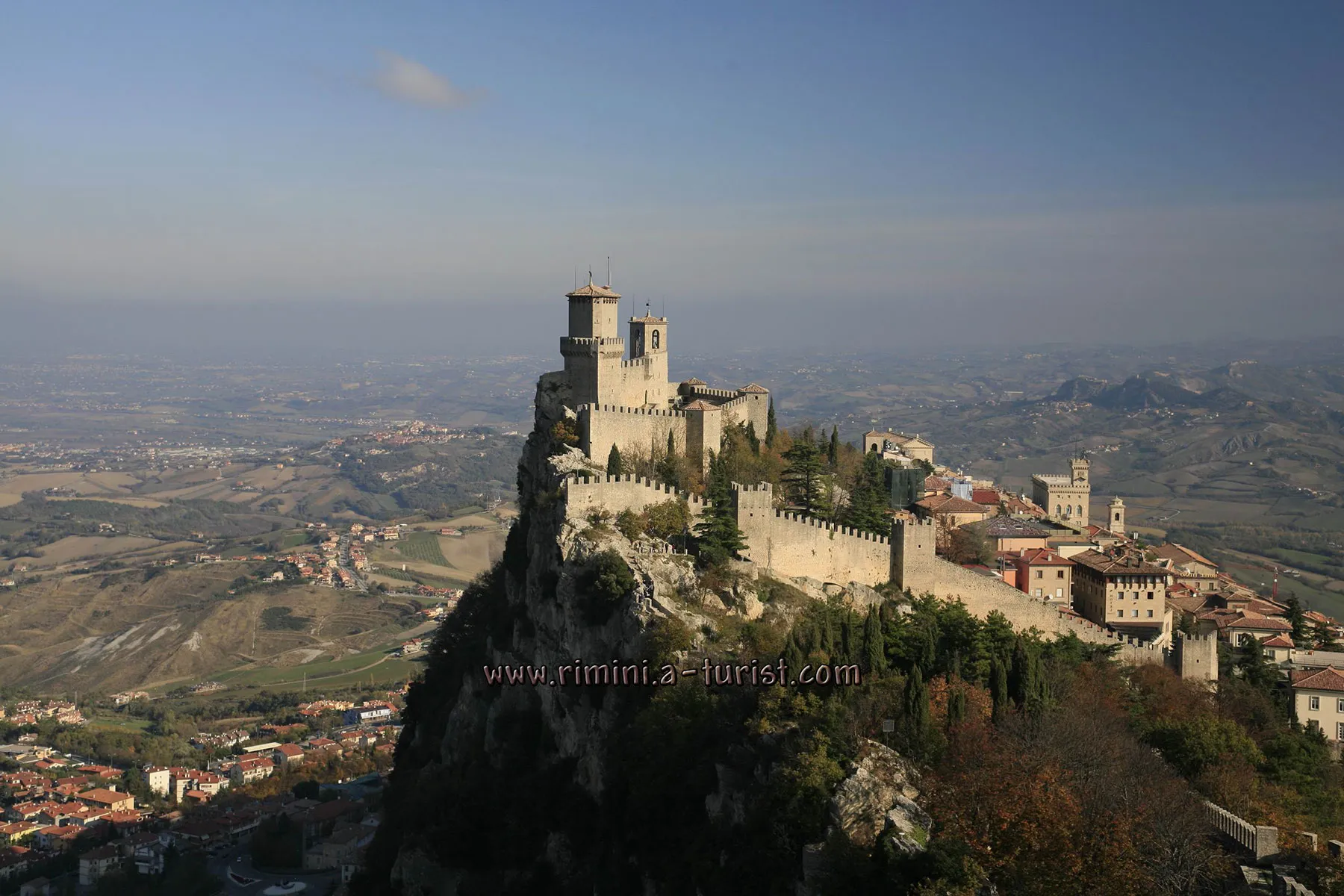 Останнє місце в нашому списку, але далеко не останнє за значенням для багатьох туристів, займає відвідування однієї з найменших незалежних держав 10 Сан-Марино. Щорічно туди приїжджають мільйони мандрівників з усього світу. Дістатися до цього красивого містечка можна на звичайному автобусі, який відправляється з центрального вокзалу Ріміні. Досить витратити півдня, щоб повністю оглянути все містечко.